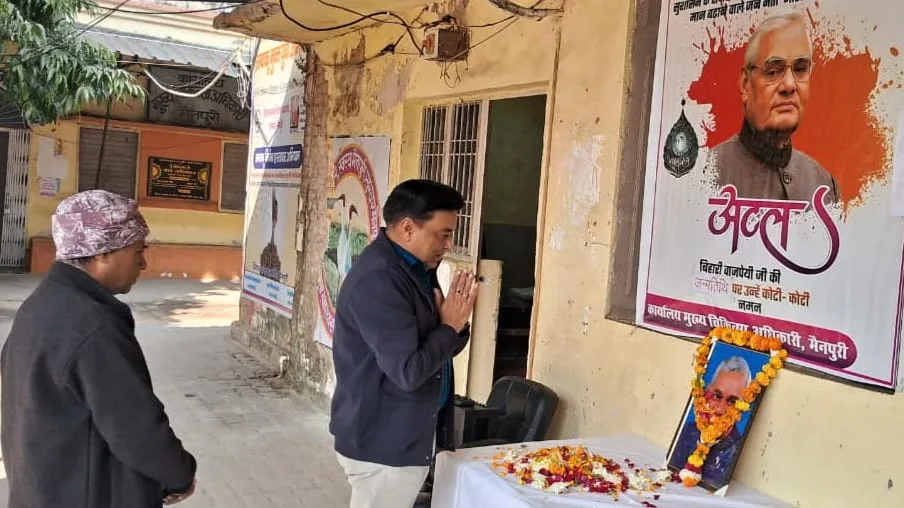 एटा। आज दिनांक 25/12/2025 को पी एम श्री कंपोजिट विद्यालय पिदौरा,मारहरा,एटा में भारत रत्न,पूर्व प्रधानमंत्री श्रद्धेय श्री अटल बिहारी वाजपेयी के जन्म दिवस और क्रिसमस दिवस अर्थात ईसा मसीह या यीशु का जन्मदिन ✝️भी साथ साथ मनाया गया। ब्लॉक बोर्ड पर अटल बिहारी वाजपेयी जी का सुंदर चित्र रेनू राजपूत द्वारा बनाया गया,इस अवसर पर विद्यालय का स्टाफ सुबोध कुमार वर्मा,नीतू सिंह, ओमवीर सिंह,पुरुषोत्तम, रेनू राजपूत, पुष्पेंद्र कुमार,श्याम मोहन शर्मा, पुष्पेंद्र कुमार, किरन शाक्य,राजकुमारी और बच्चे उपस्थित रहे।