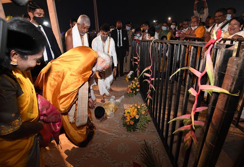 ‘स्टैच्यू ऑफ इक्वेलिटी’ के उद्घाटन समारोह के दौरान ‘दंडवत प्रणाम’ करते हुए एक बच्चे ने प्रधानमंत्री नरेंद्र मोदी का आशीर्वाद लिया।